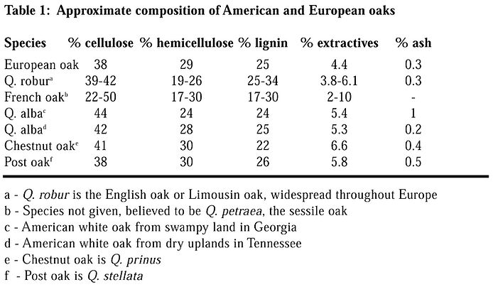 同其他木質植物一樣,組成橡樹既物質最大分為三類: 纖維素(Cellulose)、半纖維素(Hemicellulose)同木質素(Lignin)。另外仲有單寧(Tannis)、少量既油脂同蠟質。唯一一種只可以係美國白橡木搵到既就係橡木內酯(Oak Lactones)。